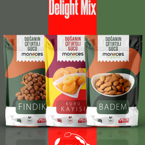 Nutty Delight, lezzetli bir kombinasyon olan Giresun fındığı, Datça bademi ve Jumbo boy Malatya kuru kayısısından oluşan bir atıştırmalıktır.