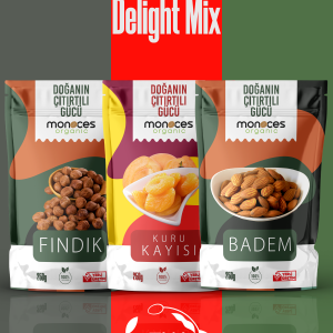 Nutty Delight, lezzetli bir kombinasyon olan Giresun fındığı, Datça bademi ve Jumbo boy Malatya kuru kayısısından oluşan bir atıştırmalıktır.